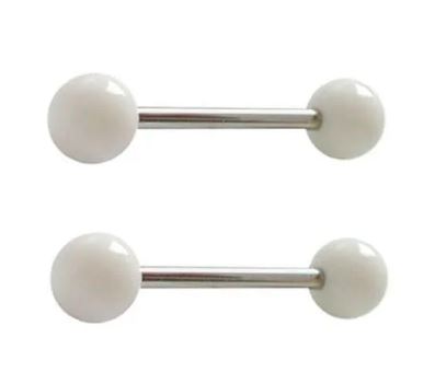 Piercing lengua barra de acero quirurgico bolitas de acrilico blanco.